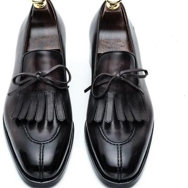 Handmade Black Leather Fringe Split Toe Bow Style Leather Loafer Shoes