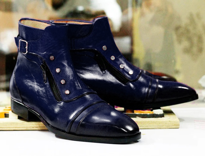Handmade Ankle High Navy Blue Cap Toe Leather Boot, Men's Zipper Buckle Boot