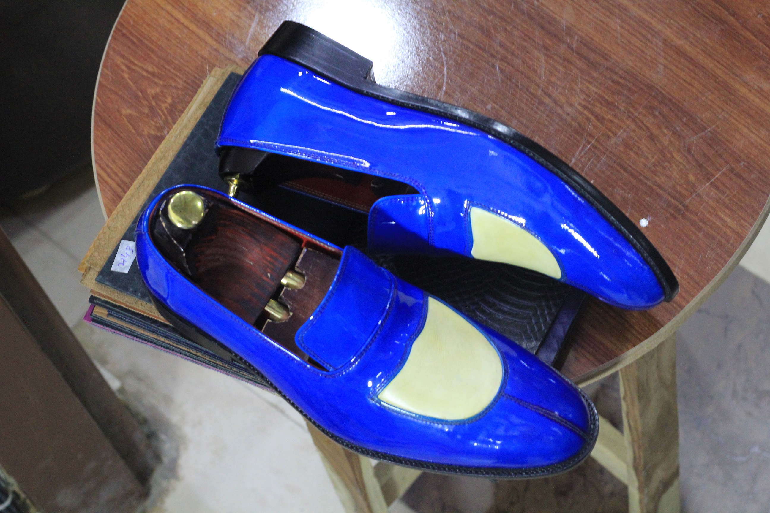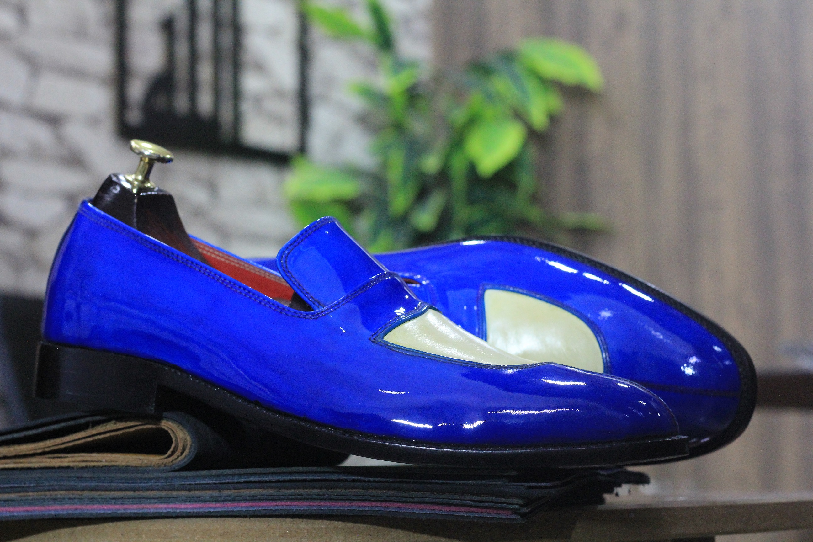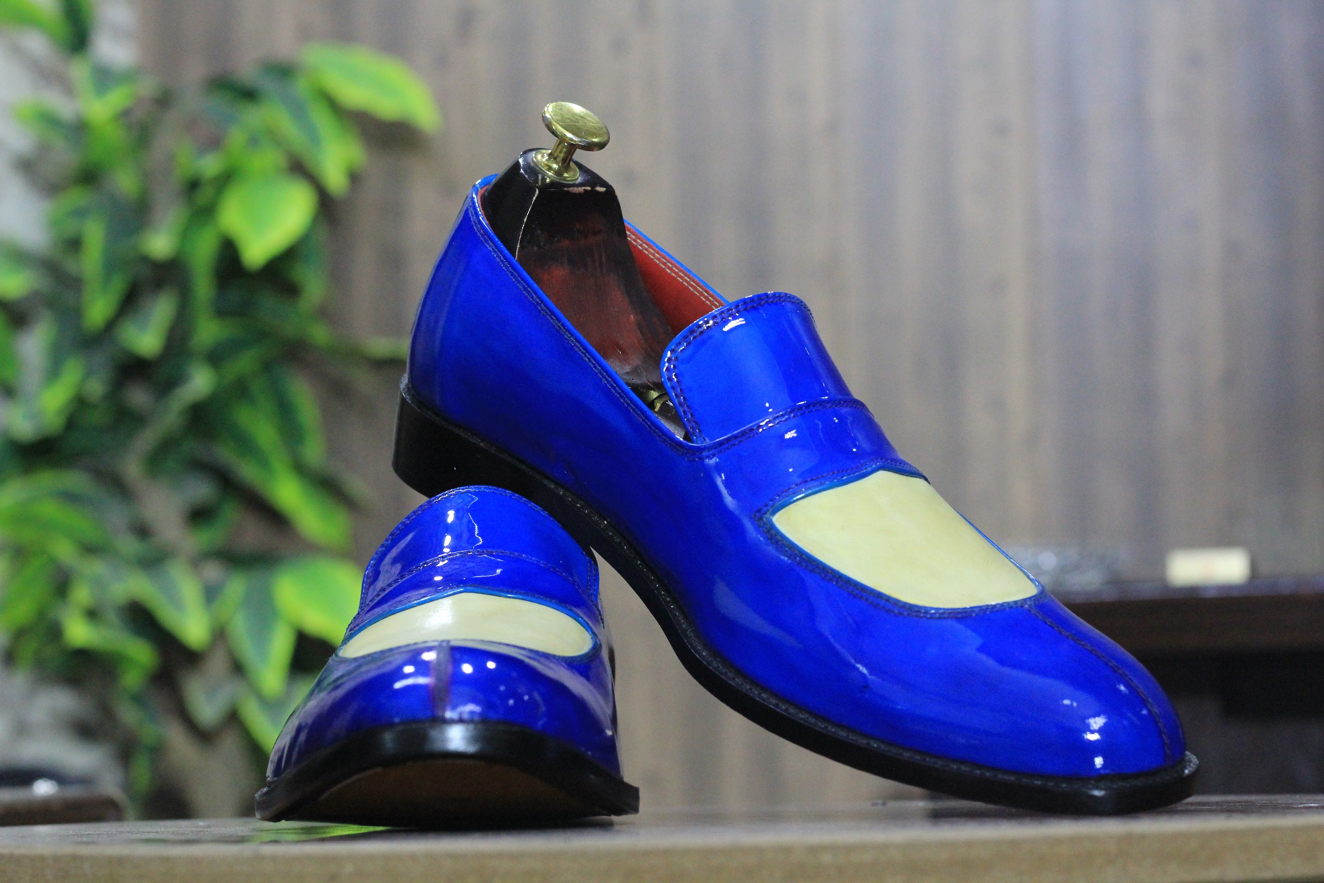 Men's Handmade Blue White Slip On Moccasin Leather Shoes, Men's Classic Shoes