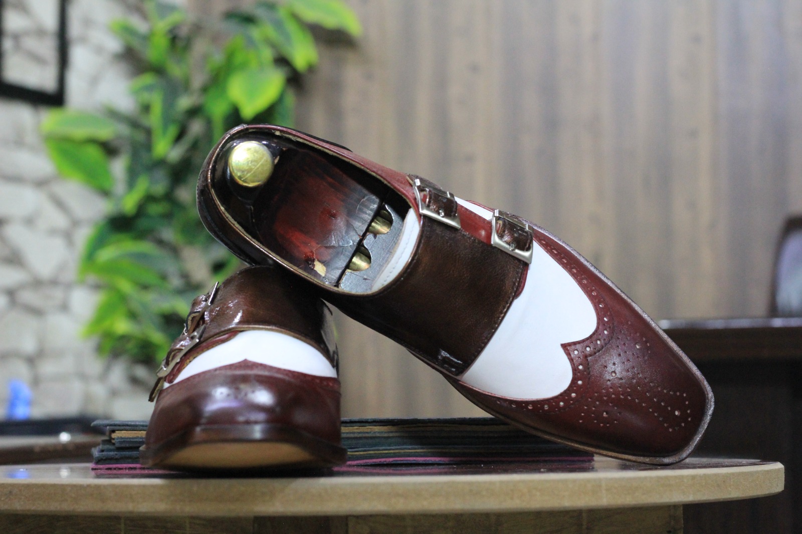 New Handmade Two Tone Double Buckle Leather Shoes, Men's Formal Wear Wing Tip Shoes