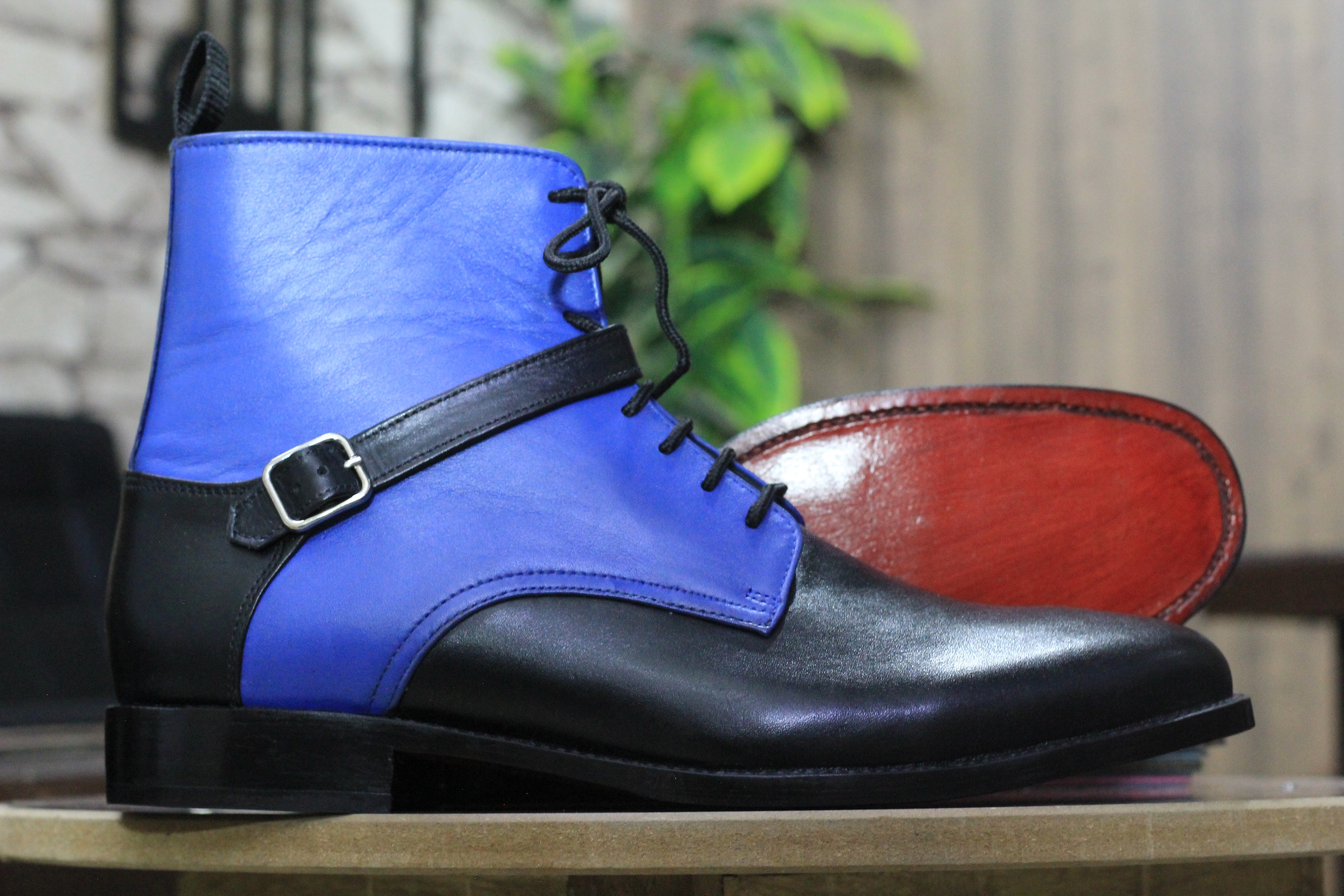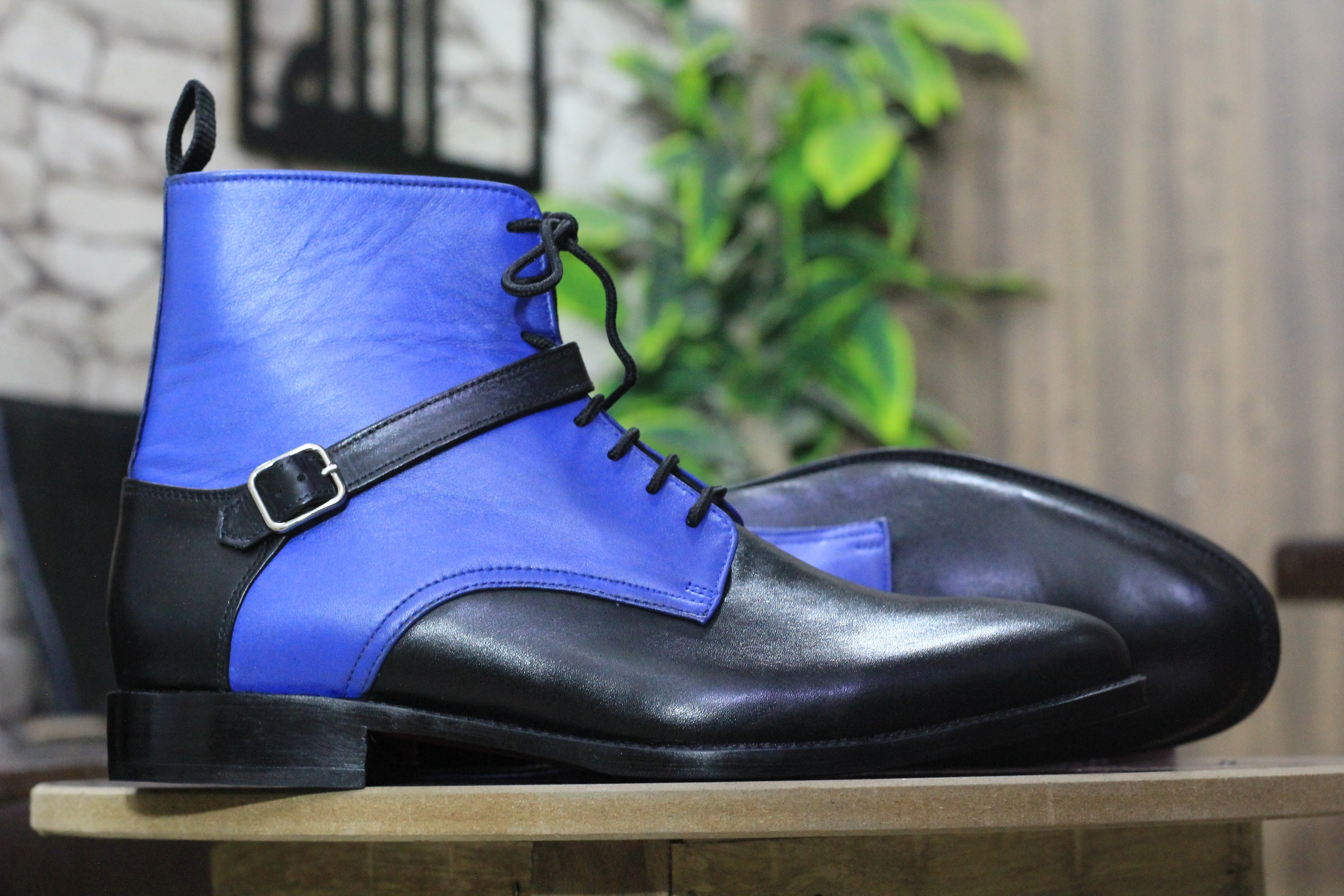 Ankle High Black Blue Leather Boot, Men's Buckle Style Lace Up Boot