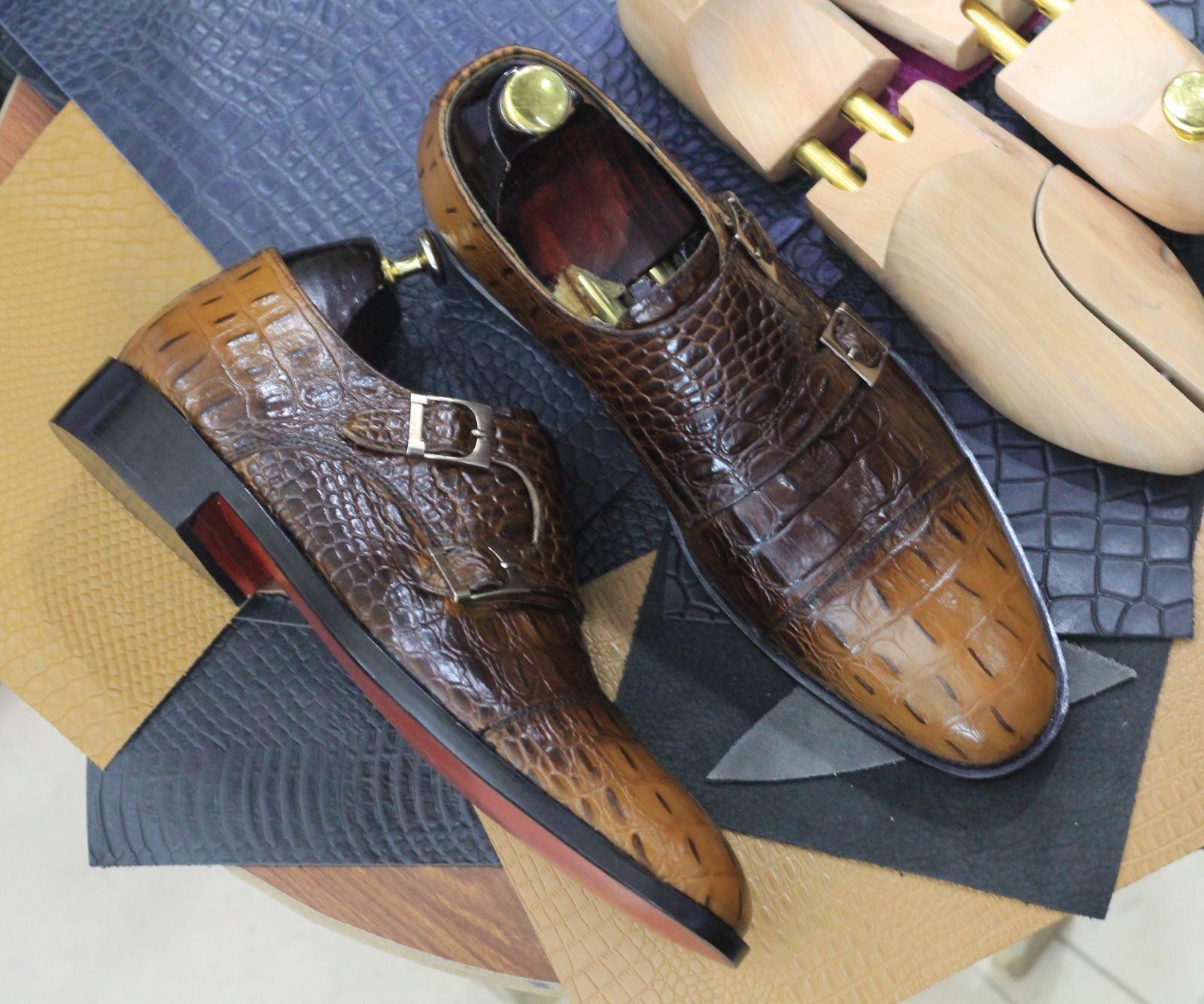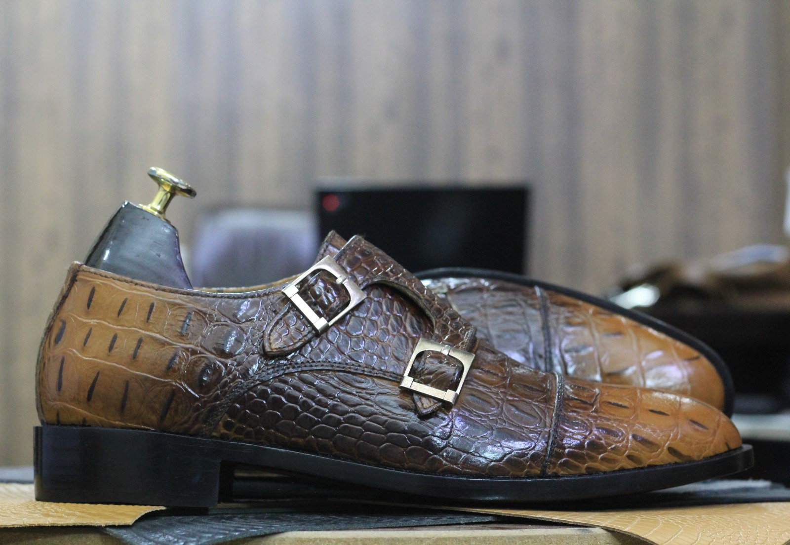 New Classic Hand Painted Crocodile Texture Shoes, Men's Double Buckle Fashion Shoes