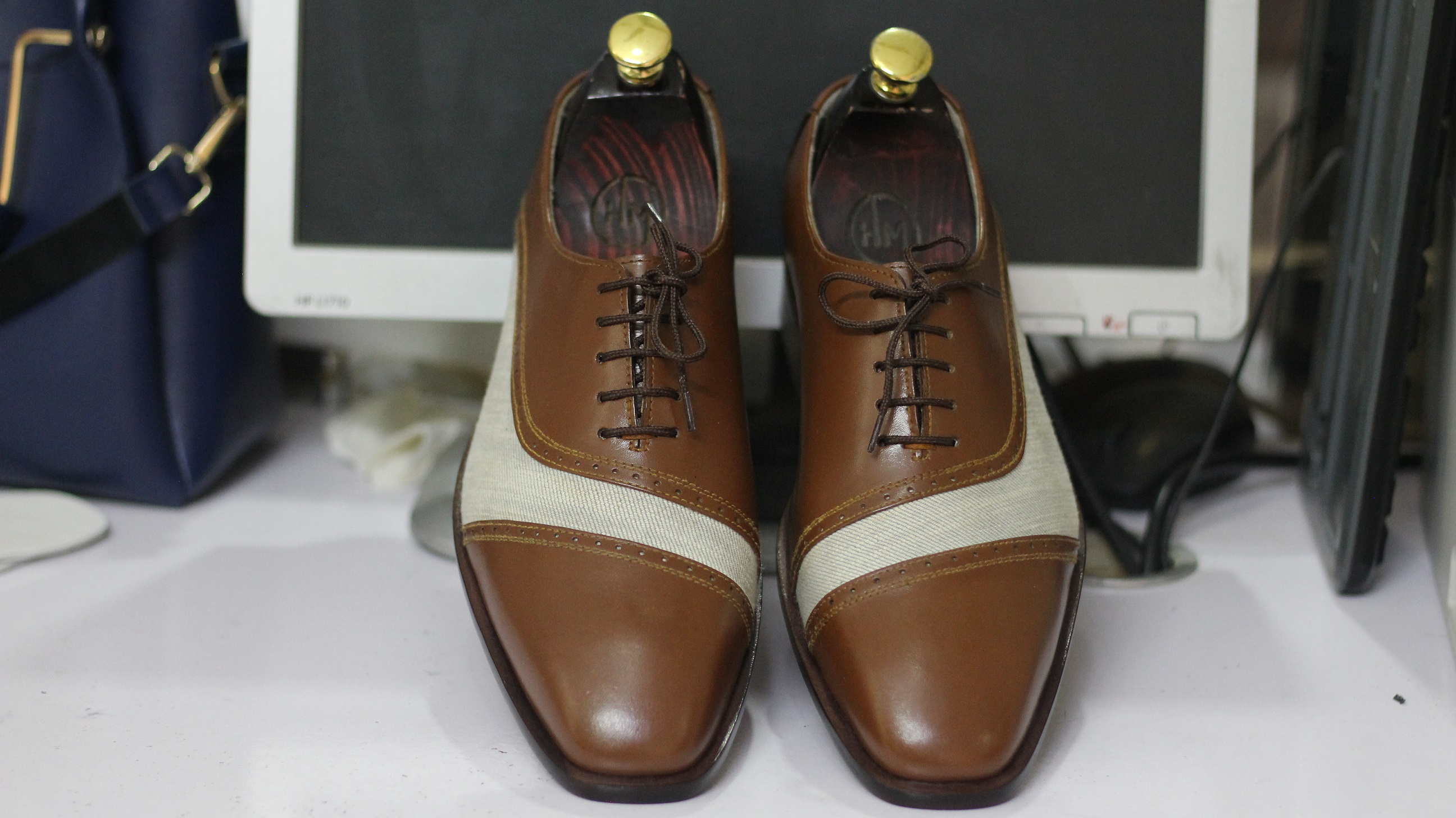 Men's Brown White Pure Leather Shoes, Handmade Men's Lace Up Style Shoes
