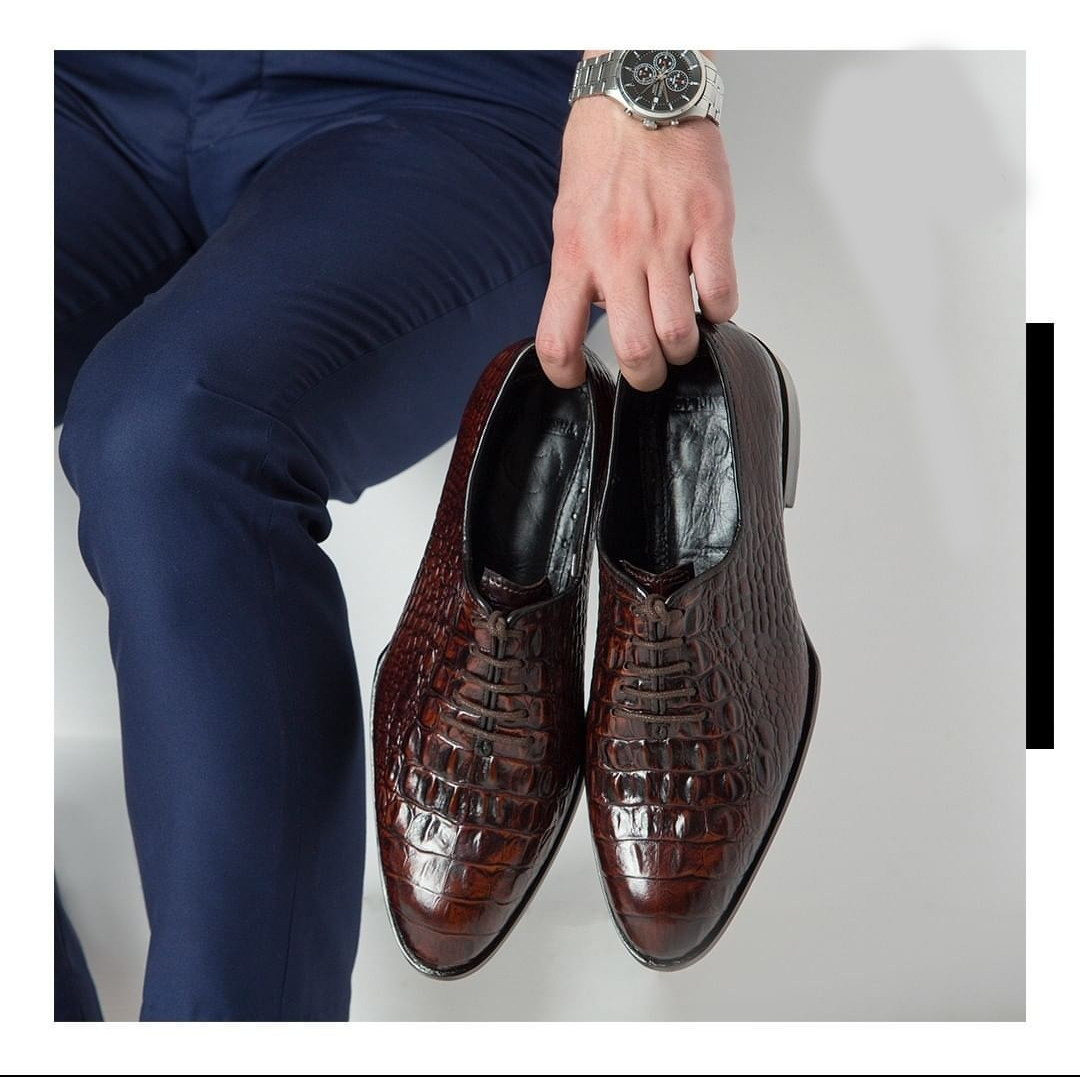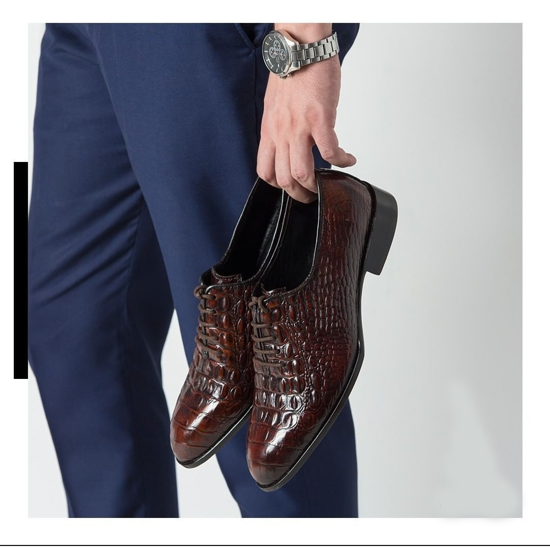 Men's Crocodile Print Leather Shoes, Oxford Whole Cut Shoes , Men's Brown Shoes