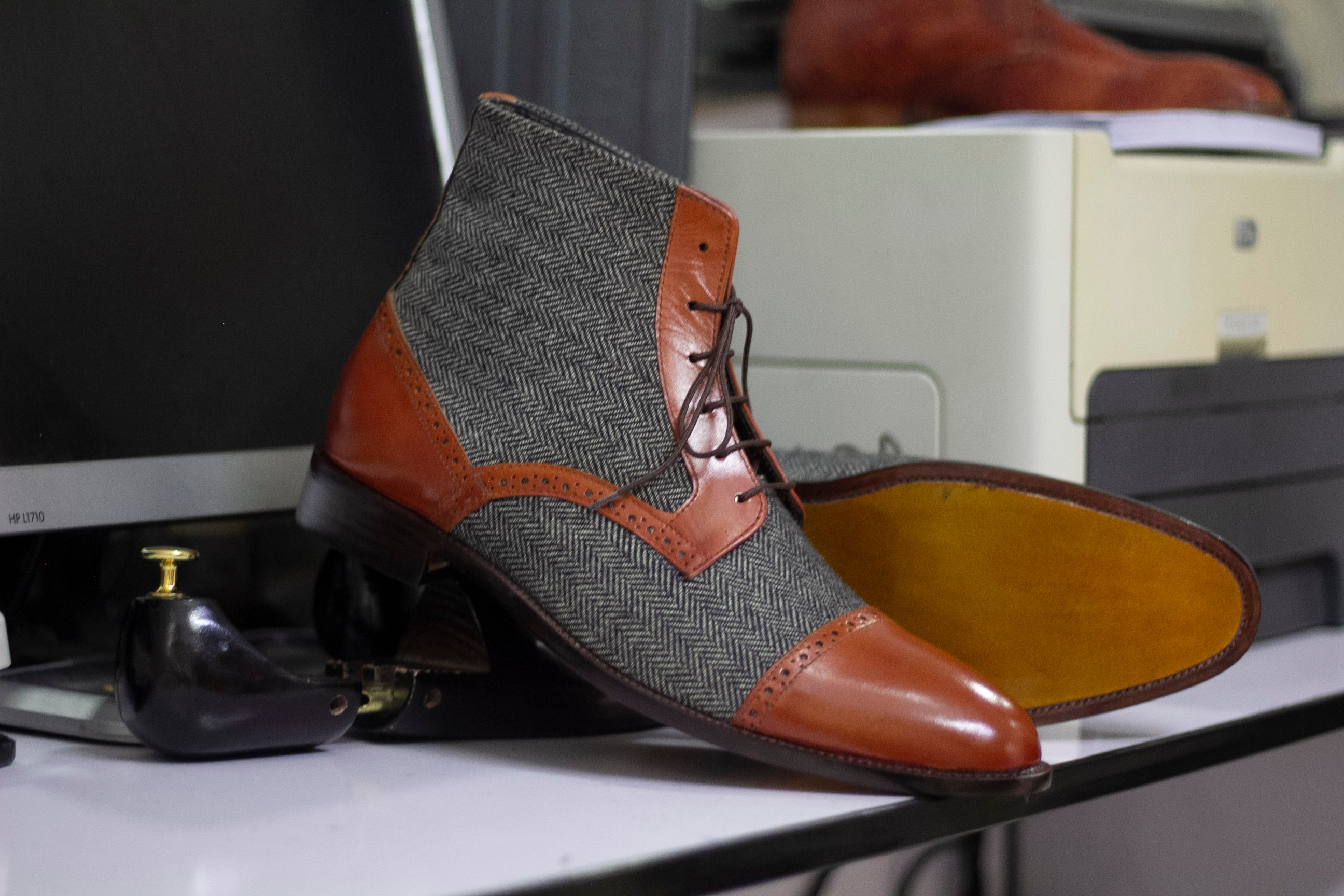 Ankle High Men's Tweed Leather & Plain Leather Boot, Handmade Two Tone Lace Up Boot