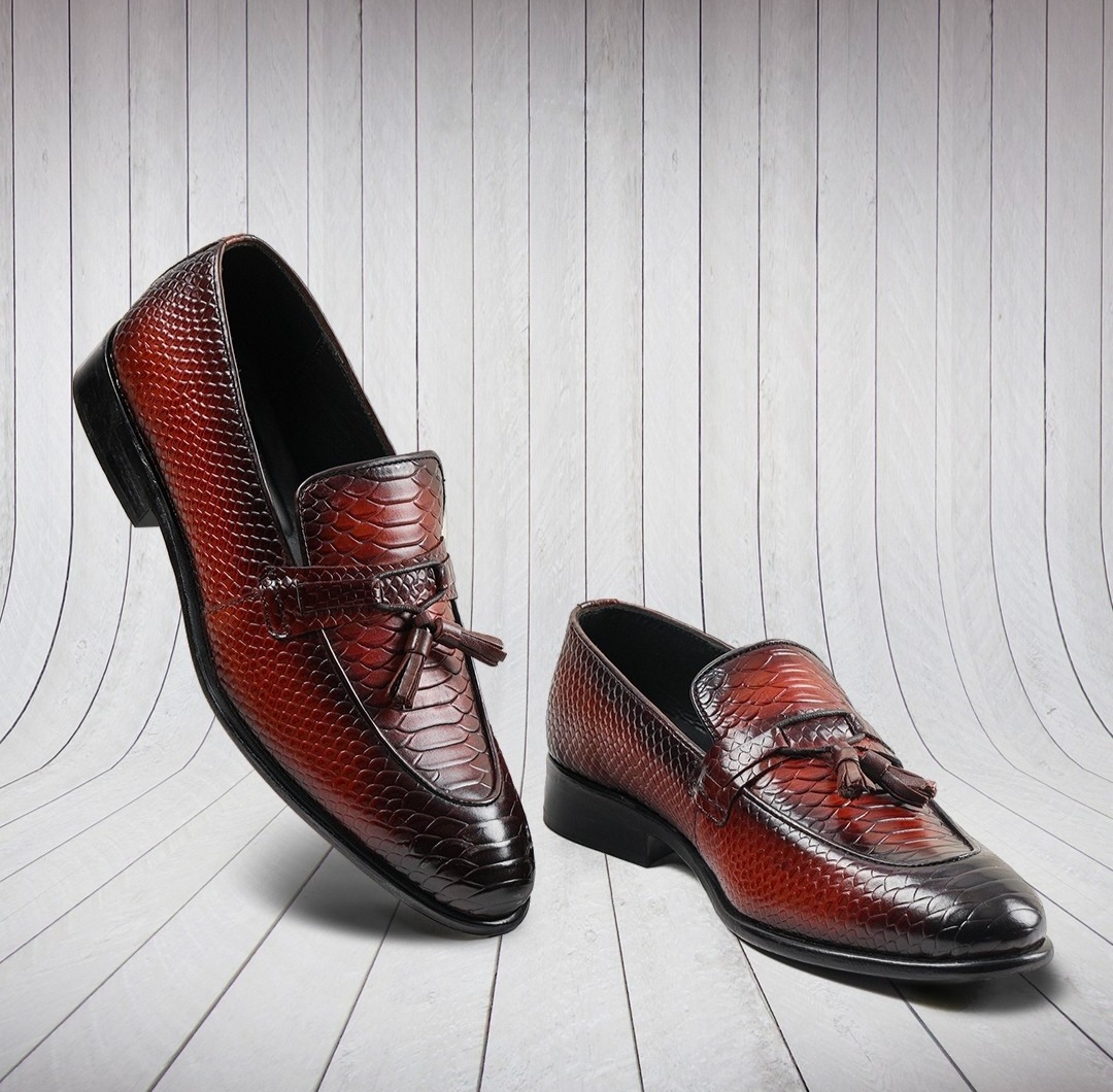 Men's Two Tone Burgundy Loafer Tussle Python Leather Shoes, Handmade Stylish Shoes