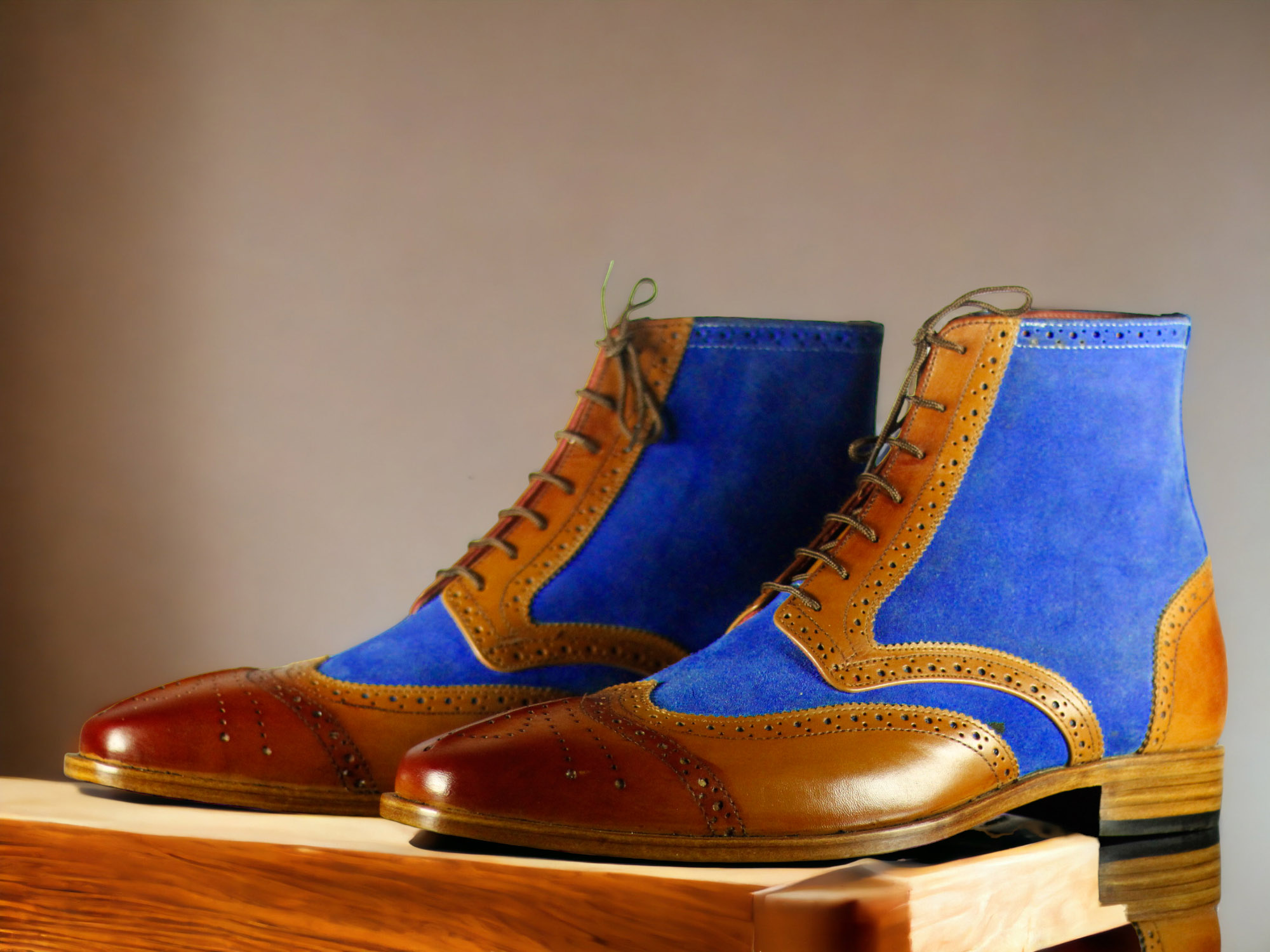 Ankle High Handmade Blue Brown Leather Suede Boot, Wing Tip Style Boot