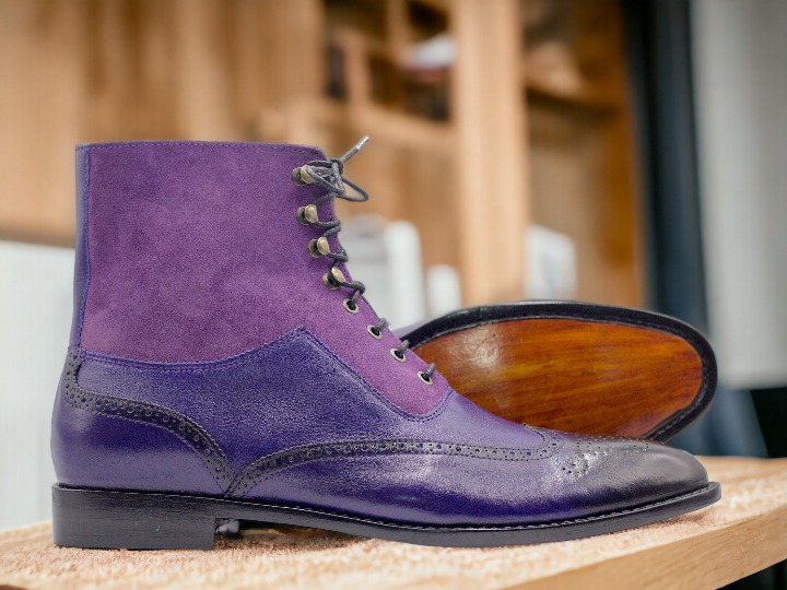 Handmade Men's Two tone Laceup Leather & Suede WingTip Brogue Ankle Boot