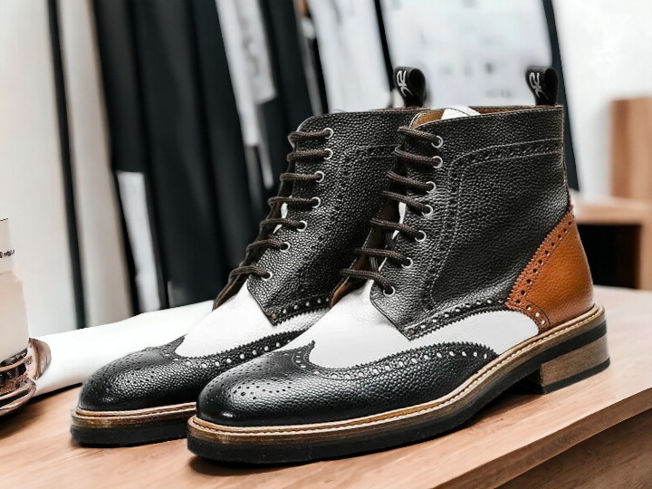 Handmade Men's Four tone Leather Wing tip Lace up Ankle Boot