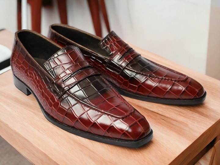 Handmade man's Red Alligator Leather Penny Loafer Shoes
