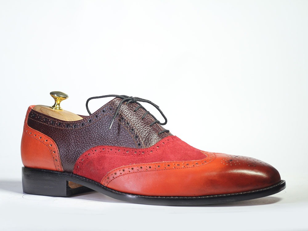 Handmade Men's Multi Tone Leather & Suede Laceup Wing Tip Dress Shoes