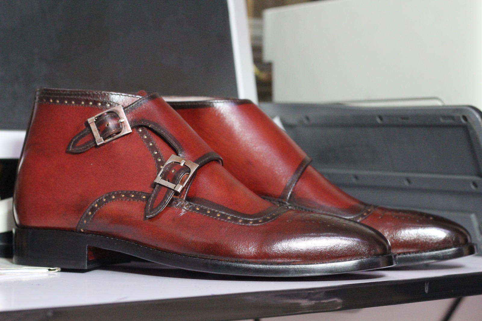 Handmade Burgundy Double Buckle Brogue Men's Leather Boot