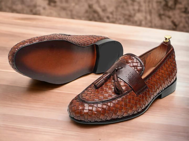 Handmade Men's Loafer Brown Tassel Apron Toe Woven Leather Fashion Designer Shoes