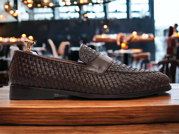 Office Shoes For Men's Brown Woven Leather Handmade Penny Loafer Shoes