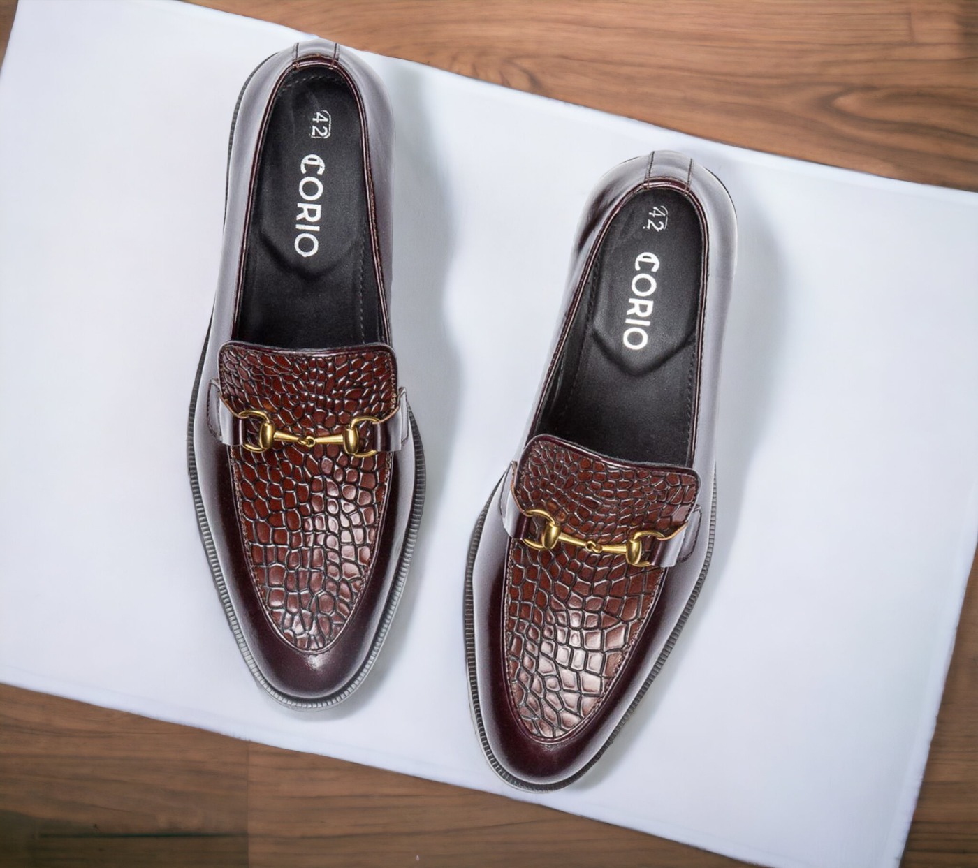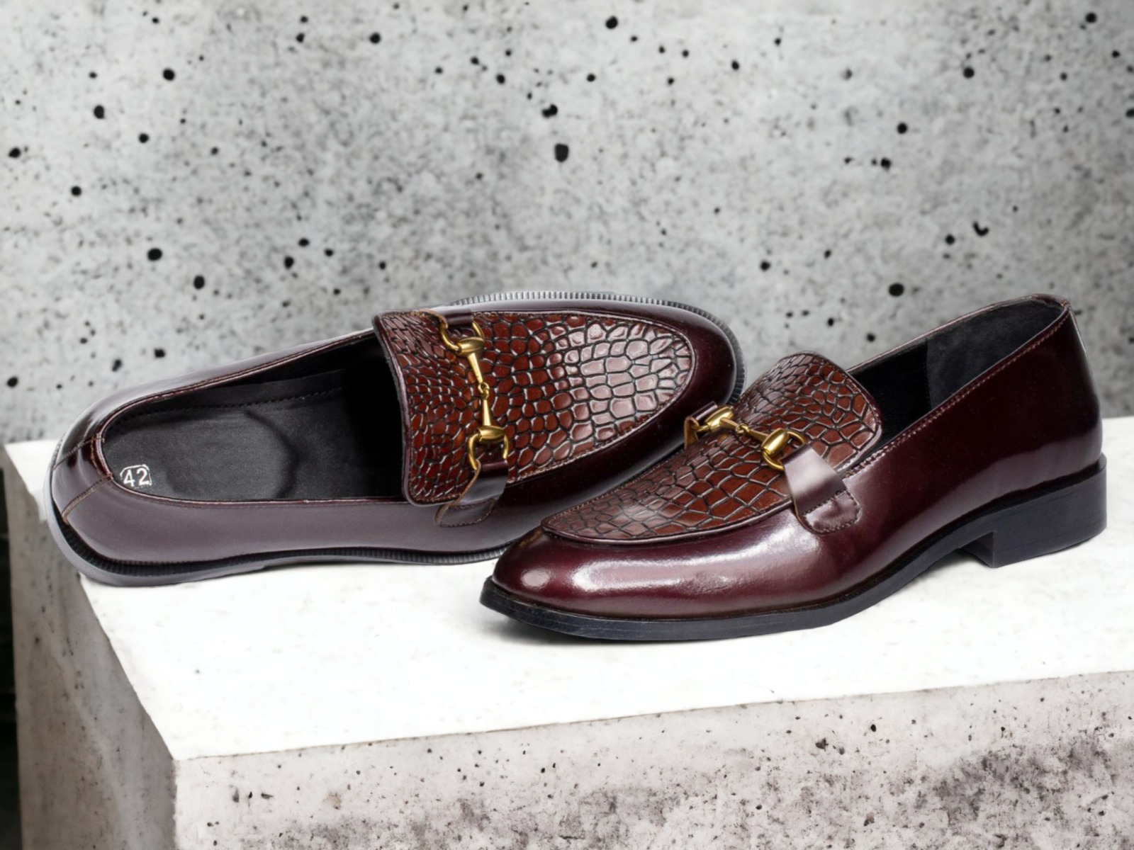Handmade Men's Brown Alligator Print Leather & Plan Leather Horse Bit Loafer Shoes