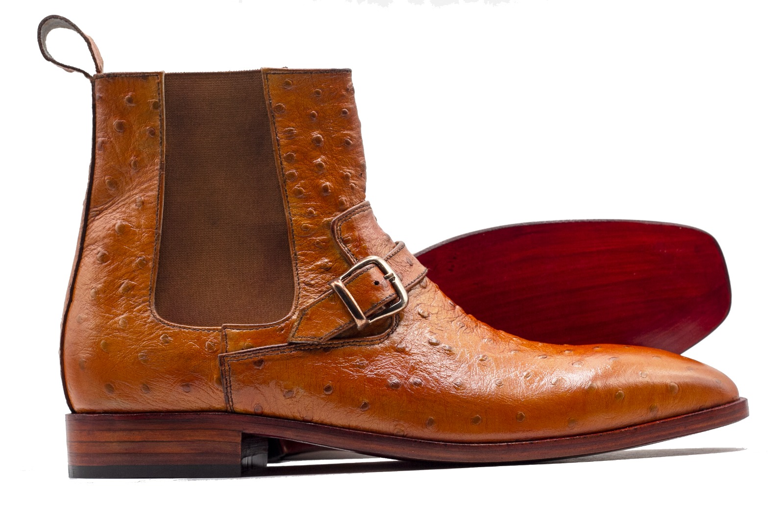Ankle Ostrich Leather Chelsea Buckle Style Handmade Boots For Men's