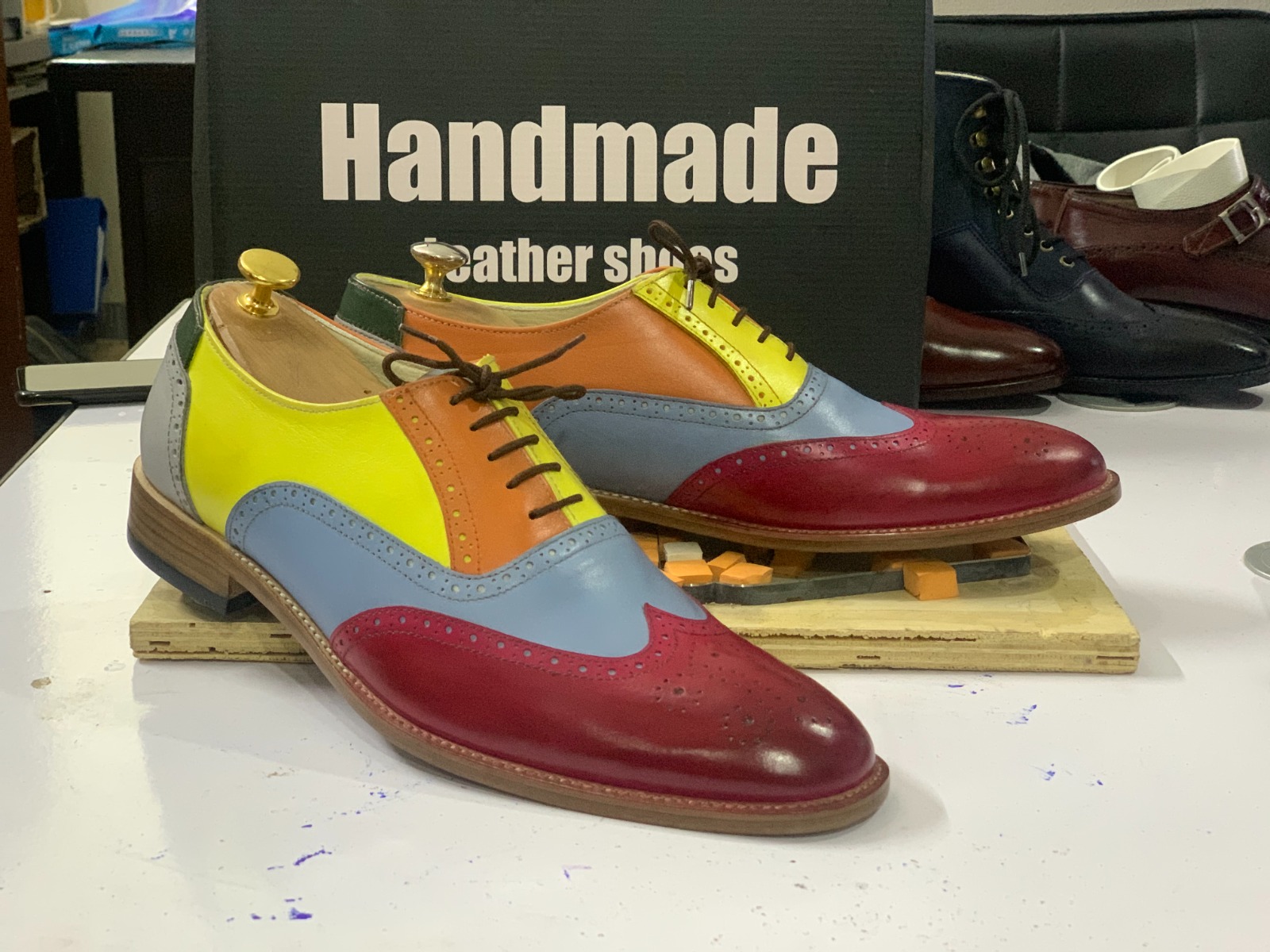 Handmade Men's Multi Tone Leather Lace Up Wing Tip Fashion Dress Shoes