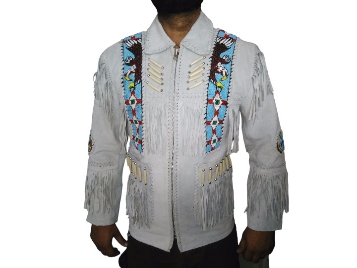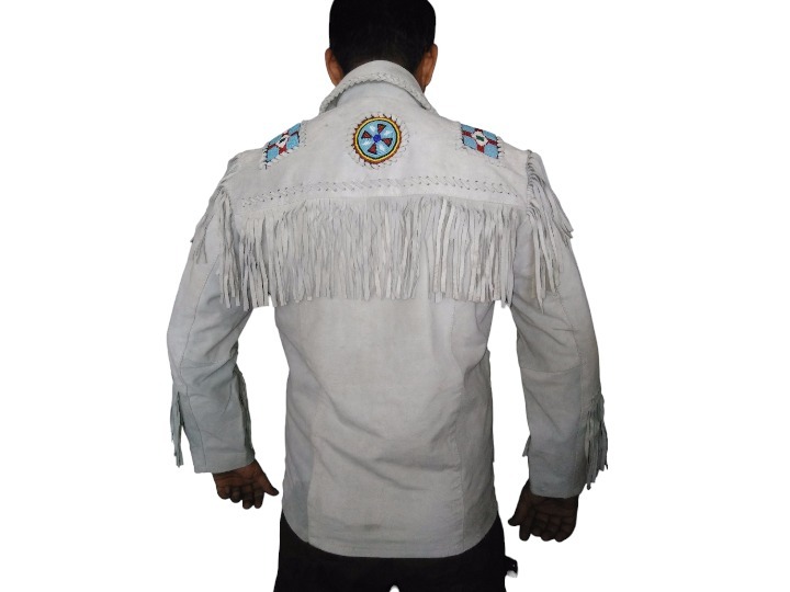 Handmade Men's White Cowboy Suede Leather Jacket Fringes & Beads