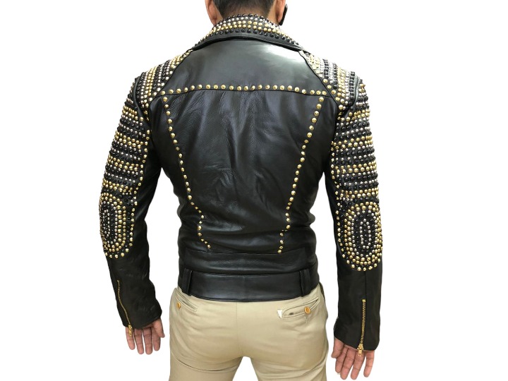 Handmade Men's Black Zipper Leather Golden Studded Jacket