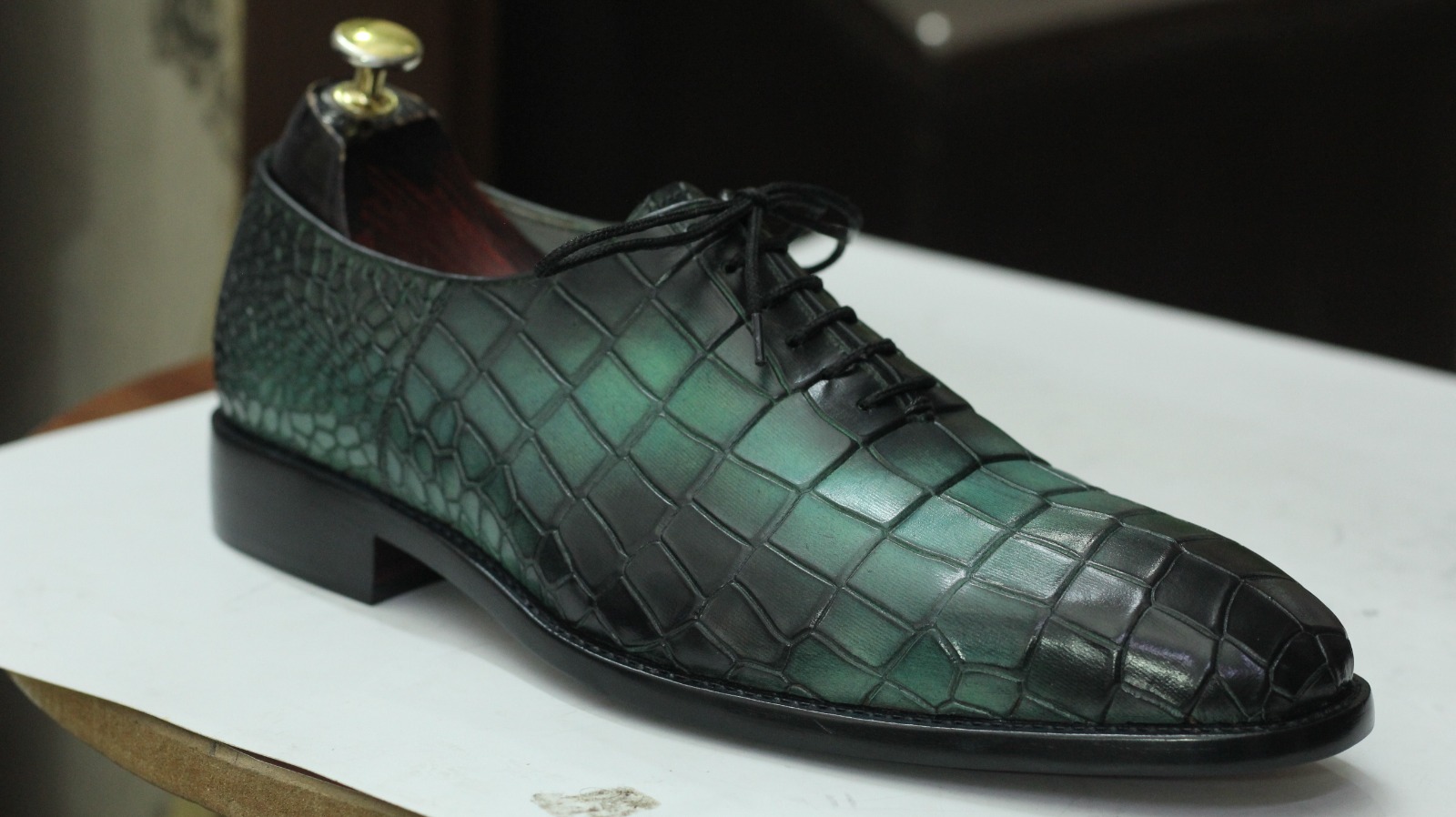Handmade Men's Green Alligator Print Leather Lace Up Office Shoes