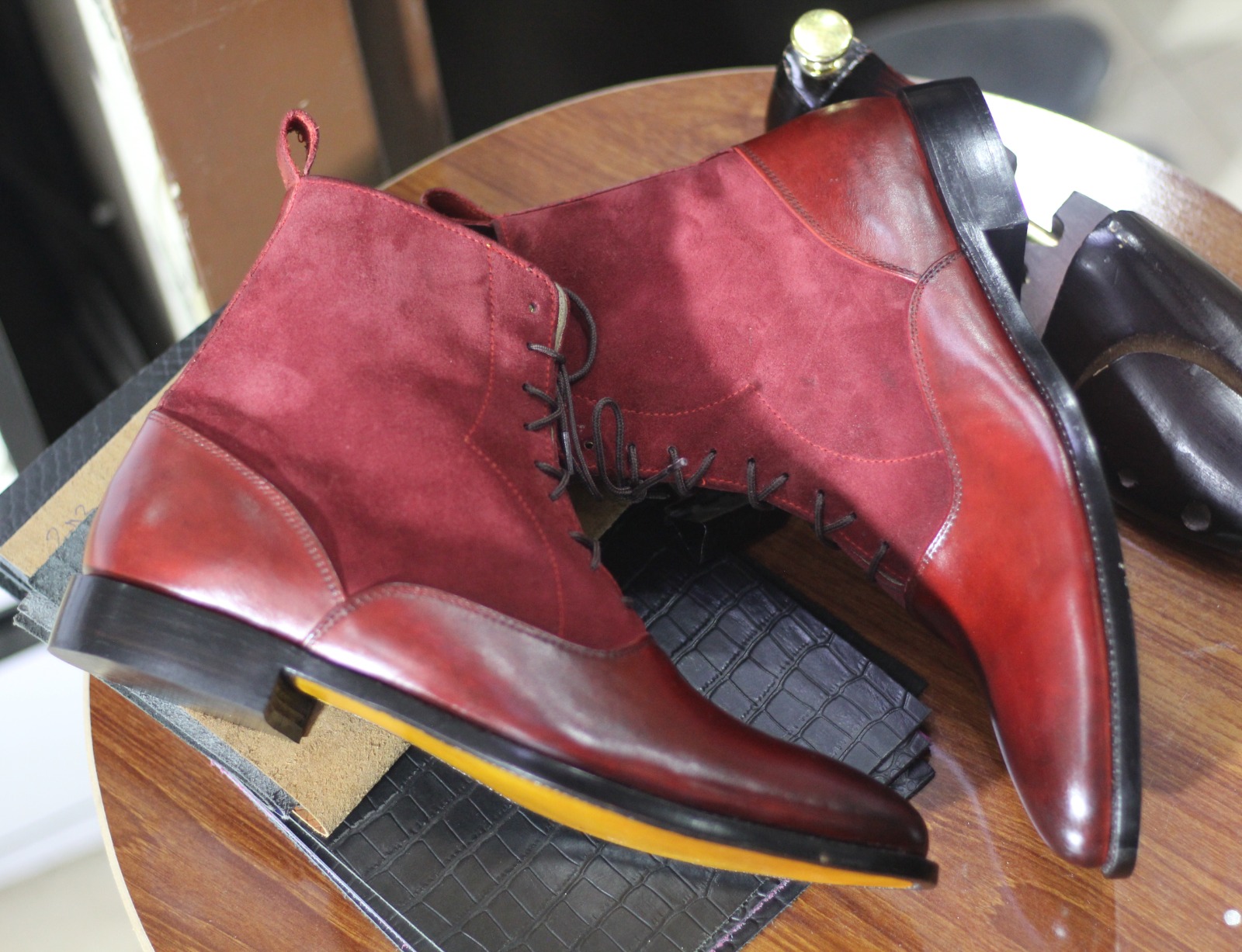 Handmade Men's Red Leather & Suede Lace Up Ankle High Boots