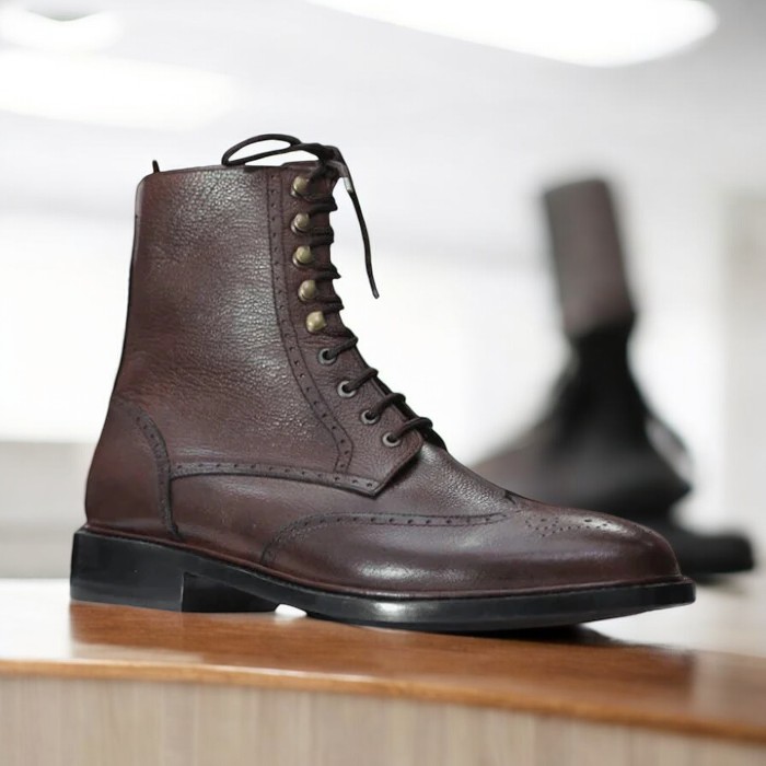 Ankle High Green Leather Handmade Boot, Men's Wing Tip Boot