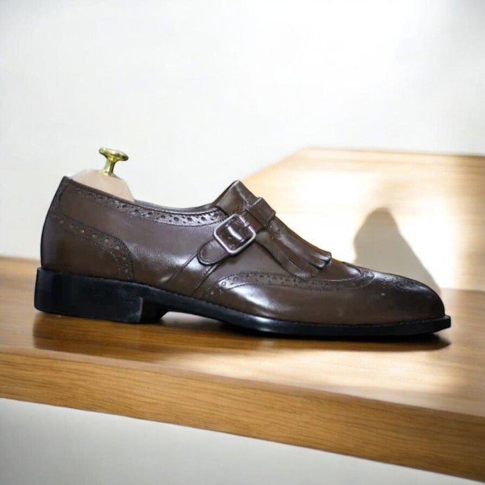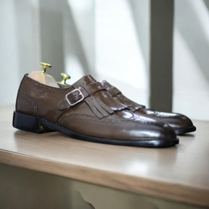 Men's Dark Brown Fringe Buckle Leather Shoes, Wing Tip Brogue Shoes For Men's