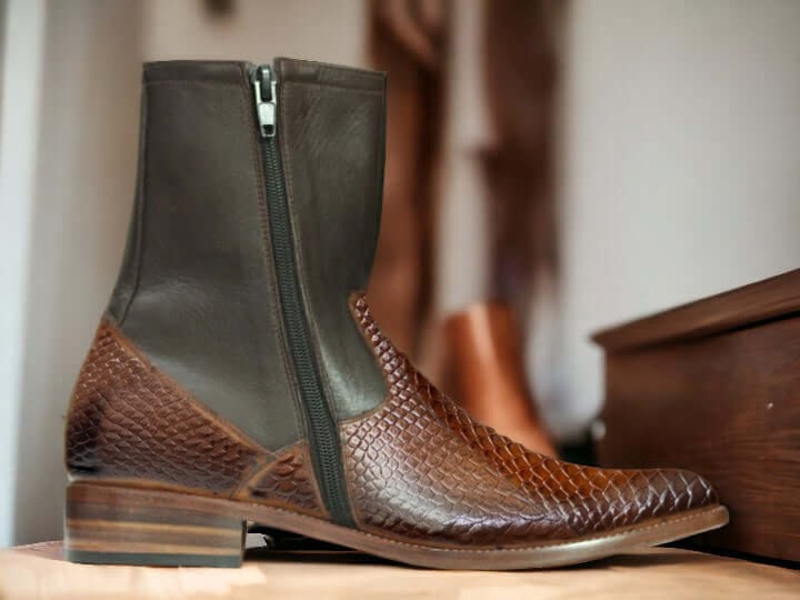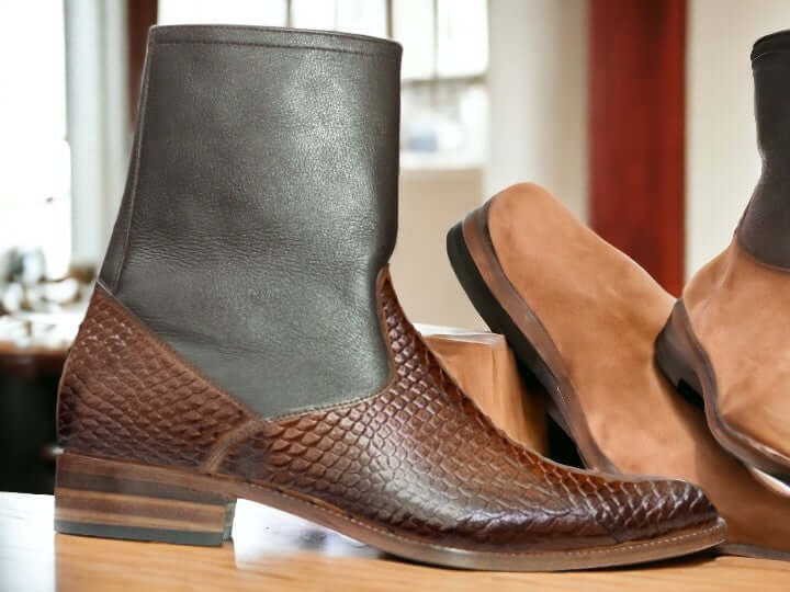 Ankle High Men's Black Brown Python Texture Boot, Hand Painted Boot