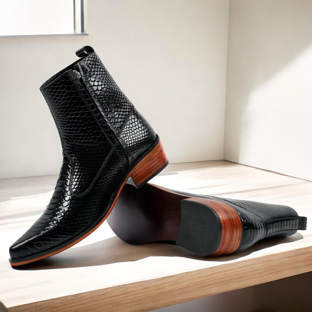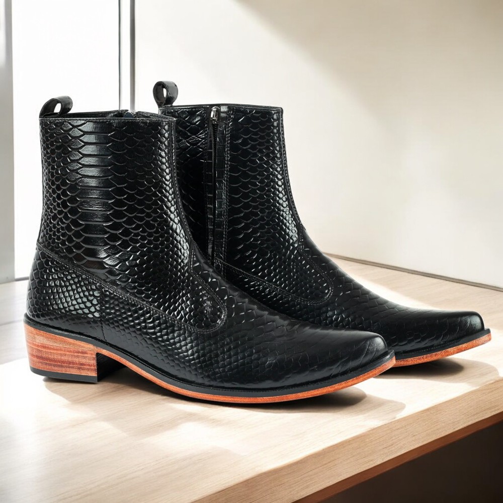 Ankle High Handmade Black Python Texture Leather Boot For Men's